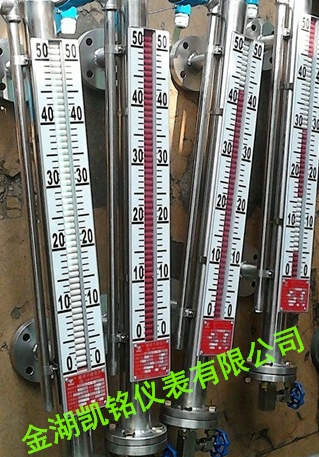 磁翻板液位計(jì)主體外的翻板箱受主體內(nèi)浮子(具有定向磁性源,按不同介質(zhì)和壓力針對研制)的作用促其翻板翻動(dòng)并顯示紅白顏色,并隨浮子的移動(dòng)指示不同的液面高度。在指示器左側(cè)配有醒目的刻度標(biāo)尺,從而使液位的指示顯得更加清晰。