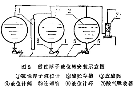 我廠頂裝式磁翻板液位計(jì)安裝,采用圖2的形式。三臺(tái)酸貯存槽②(三臺(tái)以上也可以)合用一臺(tái)液位計(jì),每臺(tái)酸槽的出口與液位計(jì),共連在一根連通管上⑤。要看某酸槽液位,開(kāi)該酸槽通液位計(jì)的閥門(mén)④,液位即可醒目顯示。如此布置能節(jié)省兩臺(tái)液位計(jì),價(jià)值四千余元(酸貯存槽數(shù)量越多,節(jié)約效果越大)。此外,在安裝時(shí)要注意:裝大浮子時(shí)重端向上;裝液位標(biāo)計(jì)(小浮標(biāo))時(shí),紅色端向上,這樣可防止磁性相斥。裝完后用備用磁鋼,將小浮標(biāo)引到大浮子磁性材料處,顯示即可正常。目前頂裝式磁翻板液位計(jì)在我廠應(yīng)用情況良好。