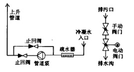 5.1如上圖所示,在原上升管道與疏水器之間增加兩條回路,其中主路由止回閥、管道泵組成。管道泵與換熱器的三暢磁翻板液位計連鎖,根據(jù)現(xiàn)場具體運行情況設(shè)置高、低液位管道泵自動啟停,磁翻板液位計的數(shù)值上傳至廠區(qū)指揮中心,實時遠程監(jiān)控,同時增設(shè)管道泵的緊急停止按鈕。旁路僅設(shè)置止回閥。在正常情況下,凝結(jié)水可以通過旁路的止回閥順利地回收到凝結(jié)水回收裝置中;在非正常情況下,則可以憑借管道泵加壓后,順利回收。