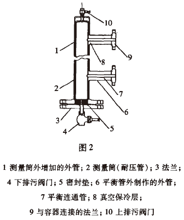 在原有的液位計結(jié)構(gòu)基礎(chǔ)上,在測量筒外增加一真空保溫層。由于測量筒中的液體跟容器中的液體是相同的,故測量筒外的真空保溫層阻隔了測量筒內(nèi)的低溫液體與外界空氣的溫度影響。實踐證明。此項改進(jìn)確實起到了良好的隔溫作用。但此結(jié)構(gòu)在實際裝置運行中,平衡連通管周圍會凝結(jié)出大量冰塊。通過分析,由于測量筒與容器間是通過上下兩根平衡管相連接的,在液位計可正常指示時,下平衡管中始終充滿低溫液體。因在測量筒外增加的真空保溫層不能阻隔平衡管與外界的直接接觸,故在平衡管四周還是會出現(xiàn)大量的冰塊。