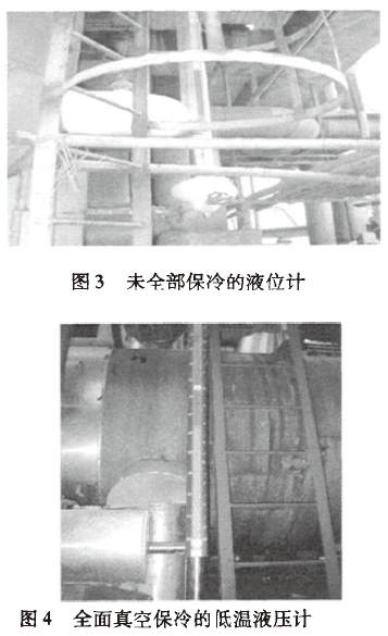 從圖3和圖4可見,平衡連通管無真空保溫層的液位計,有冷凝冰塊出現(xiàn)。加了之后,冷凝冰塊全部消失。