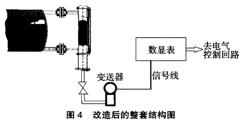 在外配1塊可輸出開關量接點的模擬量顯示儀表,這樣可實現(xiàn)液位的自動控制,集體的偏差多少可以在就實際進行整定試驗。整套測量系統(tǒng)的結構圖見圖4。