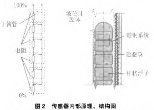 傳感器的作用是采樣液位高低位置并轉(zhuǎn)換成標準信號傳送至控制室,傳感器實際由干簧管和電阻組成。當浮子內(nèi)磁鋼位置變化后,磁場通過器壁帶動傳感器內(nèi)干簧管觸點吸合。干簧管吸合的位置決定回路的阻抗大小,干簧管的通常位置為10mm1組。回路的大小正好與液位的高低成正比,這樣*后由置于傳感器外殼內(nèi)的變送器將電阻信號轉(zhuǎn)換成標準的電流信號,送至控制室。具體結(jié)構(gòu)、原理圖見圖2。