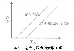 針對設備的故障,技術人員采取了更換多種質(zhì)量好的磁感應開關(如耐高溫型等),以及基于磁翻板的外貼式模擬量液位控制,但效果均不理想。其他液位測量(如超聲波等)造價較高,而且需要對設備進行相應的改造,并且停運一段時間,而該系統(tǒng)屬于公用,上述條件均無法滿足。既要實現(xiàn)自動控制,又要相應允許實施。技術人員再次結(jié)合系統(tǒng)圖進行了分析:該水位溢流處和下限處范圍還是比較寬裕,而且箱體為非承壓容器,所以箱體內(nèi)的壓力和大氣壓相差不大,即便是有也基本上保持恒定,結(jié)合原水位測量的結(jié)構(gòu),考慮在帶報警開關磁翻板液位計的液位測量筒下部加裝1臺壓力變送器,在箱體壓力不是很大且基本恒定的情況下,液位與壓力值基本成對應關系(只是在現(xiàn)場修正疊加一個常數(shù)值來消除箱體上不恒壓所帶來的偏差)。液位與壓力的關系曲線見圖3。