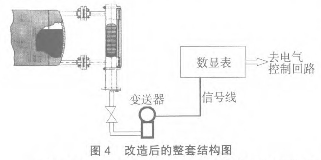 在外配1塊可輸出開關量接點的模擬量顯示儀表,這樣可實現(xiàn)液位的自動控制,集體的偏差多少可以在就實際進行整定試驗。整套測量系統(tǒng)的結(jié)構(gòu)圖見圖4。