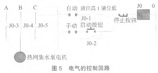 電氣的控制回路見圖5,這樣將數(shù)顯表的接點引入控制回路,可以實現(xiàn)液位高低的自動控制。同時見圖5集水箱帶報警開關磁翻板液位計下測點位置與變送器的位置之間可以存一段冷卻后的水,這樣可以保證變送器不會被高溫度的疏水而損壞。