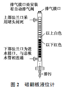它結(jié)構(gòu)是利用旁通管的原理, 主導(dǎo)管內(nèi)的液位和尾水管內(nèi)的液位高度一致, 根據(jù)阿基米德定理, 磁性浮子在液體中產(chǎn)生的浮力和重力平衡, 當(dāng)尾水管中的水位升降時(shí), 液位計(jì)主導(dǎo)管內(nèi)的浮子也隨之升降, 浮子內(nèi)的永久磁鐵通過磁耦合驅(qū)動指示器內(nèi)的翻板指示器, 當(dāng)液位上升或下降時(shí), 翻板指示器由白色翻轉(zhuǎn)為紅色, 或由原來的紅色翻轉(zhuǎn)為白色, 指示器的顏色改變的高度就是被測水位的實(shí)際高度, 從而實(shí)現(xiàn)液位的現(xiàn)場指示, 以供運(yùn)行人員目測尾水管的實(shí)時(shí)水位。安裝于液位計(jì)管壁外側(cè)的磁記憶開關(guān),可多點(diǎn)設(shè)置、滑動調(diào)整位置, 提供了液位開關(guān)量報(bào)警功能。在裝置的頂部安裝了一個自動排氣裝置, 當(dāng)主導(dǎo)管內(nèi)液位上升時(shí)能夠自動的排氣, 下降時(shí)能夠按時(shí)補(bǔ)氣。