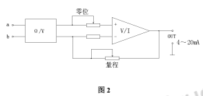 來(lái)自液位傳感器的對(duì)應(yīng)液位高度的電阻信號(hào),進(jìn)入圖2所示的a,b端,經(jīng)處理后*終輸出4~20mA DC標(biāo)準(zhǔn)信號(hào)。