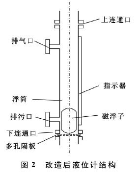 (3)方案3。改造現(xiàn)有的液位計,采用上下端日連接,上過程進日改為排氣口,下過程進日改為排污口,原安裝浮子法鑄和排氣閥接日改為連通日,在下部增加一個多孔隔板,保證浮子不進人工藝管線,同時保證液體的正常流動。在保證不改變液位計結構情況下,將液位計與工藝管線連接。此方案優(yōu)點是花費少,不閑置設備,并且還能達到液位計與管線清理同步,實現(xiàn)維修與檢修同步。