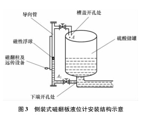 側(cè)面安裝方式的關(guān)鍵點(diǎn)在于: ①酸槽內(nèi)壁襯有瓷磚, 故引流管上開孔應(yīng)選擇槽蓋合適位置, 下孔*好在進(jìn)口管上, 且均需加閥門, 便于維護(hù); ②考慮管內(nèi)硫酸在*端天氣時(shí)對(duì)磁翻柱及測(cè)量裝置的影響,因本公司循環(huán)槽溫度在75 ℃左右, 為避免夏天溫度過高影響傳感器測(cè)量, 冬天防凍, 管徑 D 應(yīng)在 80mm 以上可保證正常測(cè)量。
