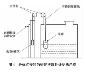 分體式蒸餾水液位計(jì)的安裝步驟如下: ①通過計(jì)算浮力和配重, 在槽體頂部合適位置安裝定滑輪, 在槽外合適位子安裝磁翻板傳感裝置; ②用直徑為 3 mm 的不銹鋼繩連接浮子和配重, 鋼繩長(zhǎng)度根據(jù)液位來計(jì)算。這里特別要注意, 磁翻板要反向安裝。