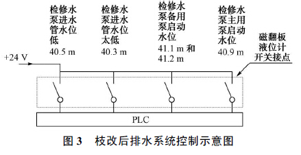 現(xiàn)場安裝丙酸液位計時, 裝置標尺的0 位, 對應(yīng)的實地高程為EL .40 .0 m 。浮子開關(guān)設(shè)定5 個水位動作值, 檢修水位低開關(guān)量報警值對應(yīng)的高程為40 .3 m ;停止所有檢修水泵的開關(guān)量, 所對應(yīng)的高程為40 .5 m ;啟動主用檢修水泵的開關(guān)量, 所對應(yīng)的高程為40 .9 m ;啟動檢修水泵主用泵的開關(guān)量, 以及要求手動啟動大泵, 并作為水位高報警上送上位機, 所對應(yīng)的高程為41 .1 m 與41 .2 m , 兩個開關(guān)量并列接入。全部開關(guān)量分別送入PLC , 如圖3所示。