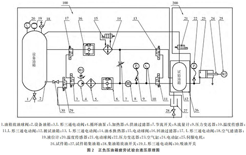 (1)循環(huán)油液控制回路,如圖2中100部分。這個(gè)部分主要由“保溫油箱、液位計(jì)、過(guò)濾器、循環(huán)油泵、加熱器、流量計(jì)、電動(dòng)三通閥、油水換熱器、耐酸堿磁翻板液位計(jì)、溫度傳感器等組成”;被試油箱滑油供回油口連接在試件箱內(nèi)供油軟管和回油軟管之間,即可對(duì)被試油箱內(nèi)部油液流動(dòng)要求及溫度進(jìn)行控制。