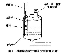 圖2中,B點靠近電機和泵,襯四氟磁翻板液位計安裝在此處既影響電機及泵的檢修,又因泵附近液位的環(huán)流波動較大,對浮子導向管沖刷嚴重,故B點不合理;C點處因有管道通過,不便維護且影響管道和泵、電機等的起吊更換,故也不能選擇C點;A點遠離泵和電機,且有足夠的空間安裝翻板,便于維護,所以A點較為合適。