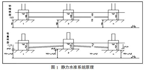 靜力水準(zhǔn)儀依據(jù)連通管的原理,采用振弦式傳感器,測(cè)量每個(gè)測(cè)點(diǎn) 容器內(nèi)液面的相對(duì)變化,再通過(guò)計(jì)算公式求得相對(duì)于基準(zhǔn)點(diǎn)的沉降量,如圖 1 所示。
