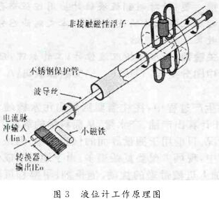 其工作原理是利用磁場脈沖波,測量時液位計的頭部發(fā)出電流“詢問脈沖”,此脈沖同時產(chǎn)生磁場,沿波導(dǎo)管內(nèi)的感應(yīng)線向下運行,在液位計管外配有浮子,浮子可隨液位沿側(cè)桿上下移動,浮子內(nèi)設(shè)有一組永久磁鐵,其磁場與脈沖產(chǎn)生的磁場相遇則產(chǎn)生一個新的變化磁場,隨之產(chǎn)生新的電磁“返回脈沖”,測定“詢問脈沖”和“返回脈沖”的周期便可知道液位的變化。因此,磁致式液位計是以浮子為測量元件通過磁耦合的變化傳遞到指示器,使指示器能夠清晰地指示出液位的高度。
