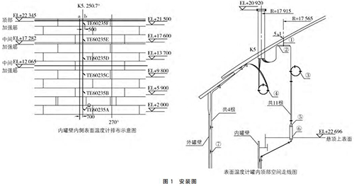 以昆侖能源華油天然氣四川廣安液化天然氣2萬(wàn)方儲(chǔ)罐為例,在安裝多點(diǎn)溫度計(jì)過(guò)程中,內(nèi)罐底部溫度熱電阻需要從內(nèi)罐浮頂進(jìn)入罐內(nèi),沿罐壁垂直向下固定在罐底部。如需夾層底部溫度測(cè)量,則需要將溫度熱電阻沿外罐壁垂直而下,固定在罐底夾層的氮?dú)夤苌?,每間隔4m布置1個(gè)電纜固線器,如圖1所示。