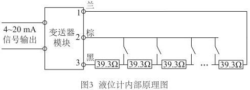 為尋求更好的改進(jìn)方案,對蒸汽夾套型磁翻板液位計(jì)的測量原理進(jìn)行了深入研究。液位計(jì)測量桿中是由等間距排布的干簧管和電阻元件組成,當(dāng)磁浮子達(dá)到某一高度時(shí),對應(yīng)的干簧管閉合,如果能識別出哪個(gè)干簧管閉合,即可獲得當(dāng)前液位值。那么變送器又是如何識別出哪個(gè)干簧管閉合的呢?再次探究測量桿內(nèi)部電路,繪制液位計(jì)內(nèi)部原理圖,如圖3所示。測量桿內(nèi)部電阻串聯(lián)連接,每兩個(gè)電阻的連接處連接干簧管的一端,干簧管的另一端并聯(lián)連接,*終引出蘭、棕、黑三根信號線。