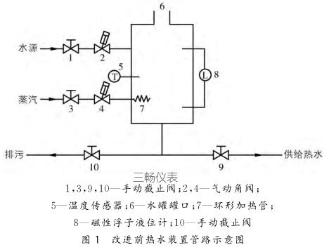 改進(jìn)后的熱水裝置主要由水源、蒸汽源、帶定位器的氣動(dòng)控制閥、手動(dòng)截止閥、蒸汽噴射器、溫度傳感器、浮球液位計(jì)、水箱以及溢流管路等組成。其工作過(guò)程為: