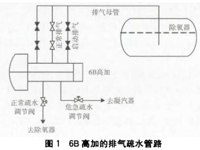 6B高壓加熱器設(shè)有2路啟動(dòng)排氣和1路正常排氣,3路排氣管道匯至1根管道進(jìn)人除氧器并插人除氧器正常液面以下,如圖1所示。啟動(dòng)階段高壓加熱器啟動(dòng)排氣閥門和正常排氣閥門均開(kāi)啟排氣,正常運(yùn)行時(shí)啟動(dòng)排氣閥關(guān)閉,正常排氣閥開(kāi)啟。排氣管線從7.5 m平臺(tái)經(jīng)過(guò)多次折向匯集到23 m排氣母管,然后再引人除氧器,這導(dǎo)致排氣管線存有蒸汽冷凝水;由于在排氣管線上存有一定的冷凝水,啟動(dòng)排氣閥開(kāi)啟后,存在于排氣管道的冷凝水依靠重力排至高壓加熱器汽側(cè),在啟動(dòng)排氣管至除氧器的管路中形成一定的真空,從而產(chǎn)生虹吸作用,使除氧器的水吸人6B高壓加熱器,導(dǎo)致B側(cè)高壓加熱器液位異常升高而發(fā)生解列。