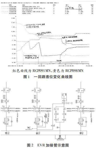 壓力容器中控制棒驅(qū)動(dòng)機(jī)構(gòu)耐壓殼中殘留的氣體壓力較大,而穩(wěn)壓器的壓力較低,壓力容器與穩(wěn)壓器之間存在壓力偏差致使 RCP098MN 與 RCP091MN 顯示存在偏差。值長反饋在調(diào)試期間,為了盡快使兩邊壓力平衡,采取的方法是拆除壓力容器排氣管線上的臨時(shí)接管( 燃料沒有臨界,一回路沒有放射性) ,使其直接對大氣。同時(shí)穩(wěn)壓器通過與 RPE002BA 相連,同樣也是相當(dāng)于對大氣壓,可以使 RCP098MN 與 RCP091MN顯示較快速地平衡。這次大修也是一直不能平衡,由于怕影響主線進(jìn)度,夜班在凌晨 3 點(diǎn)時(shí)接到領(lǐng)導(dǎo)指令拆除了臨時(shí)接管,使壓力容器直接對大氣,兩個(gè)蒸汽夾套磁翻板液位計(jì)開始顯著趨向一致,早上 6 點(diǎn)多就基本上平衡。具體曲線圖如圖 1。