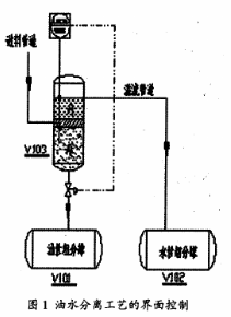 從圖中可以看出,這是一個(gè)連續(xù)化的生產(chǎn)過(guò)程。進(jìn)料管中的介質(zhì)是氯乙酸甲酯、水與甲醇的混合物,物料連續(xù)地從分離罐V103的中部進(jìn)料口流入罐內(nèi),在罐內(nèi)自然分層。上層的物料是水與甲醇組成的水性組分,下層的物料是以氯乙酸甲酯為主的油性組分,中間為混合層,工藝的要求是水性組分必須從溢流管道流出進(jìn)入V102儲(chǔ)罐;油性組分必須通過(guò)液位調(diào)節(jié)閥LV103進(jìn)入V101儲(chǔ)罐;同時(shí)為了防止物料過(guò)多,從分離罐頂部溢出,還需設(shè)置罐內(nèi)高液位時(shí)的報(bào)警。