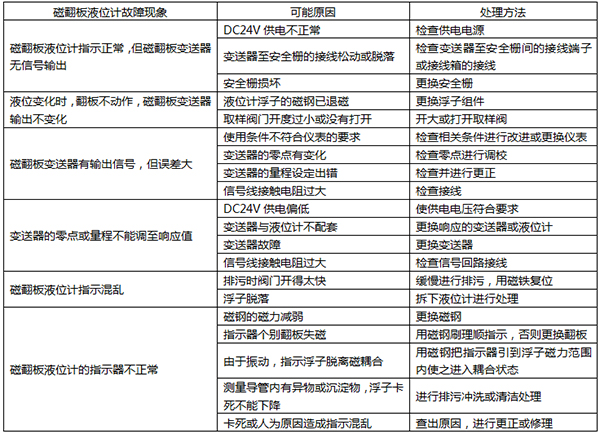 磁翻板液位計(jì)常見故障的檢查及處理如表1所示。