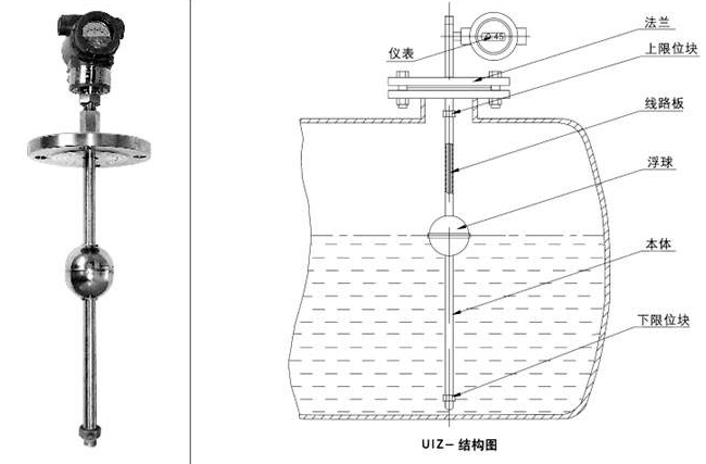 鍋爐浮球液位計由浮球、插桿等組成。浮球液位計通過連接法蘭安裝于容器頂上
