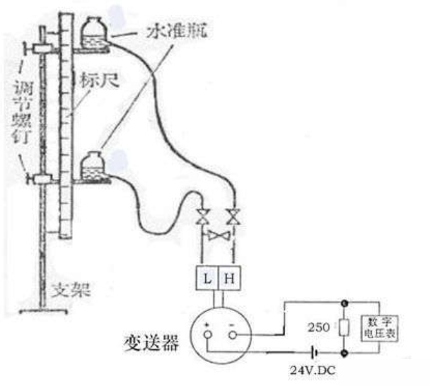當(dāng)液體密度恒定時,測出差壓就就可知道液位高度,而與液體容積無關(guān),或者說知道了液體高度,也就知道了差壓,即△P=ρH。模擬校驗法就是基于上述原理進行的?,F(xiàn)以校驗水位計為例,介紹一下具體方法,校驗裝置及接線如圖所示: