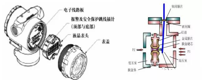 雙法蘭差壓變送器結構:主要部件為傳感器模塊、電子元件外殼、毛細管、高低壓側法蘭及膜片。傳感器模塊包括充油傳感器系統(tǒng)(隔離膜、充油系統(tǒng)和傳感器)以及傳感器電子元件。