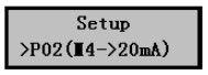 1)在污水液位計正常工作時按擊Mode鍵進入?yún)?shù)設置菜單后按擊▼鍵選擇P02(4~20mA)設置菜單,如右圖。