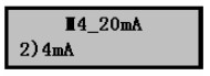 在20mA參數(shù)設置菜單按擊▼鍵進入4mA參數(shù)設置菜單,按擊OK鍵進入設置,方法同上。