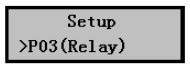 1) 在污水液位計正常工作時按擊Mode鍵進入?yún)?shù)設置菜單后按擊▼鍵選擇到P03(Relay)繼電器設置菜單,如右圖所示。