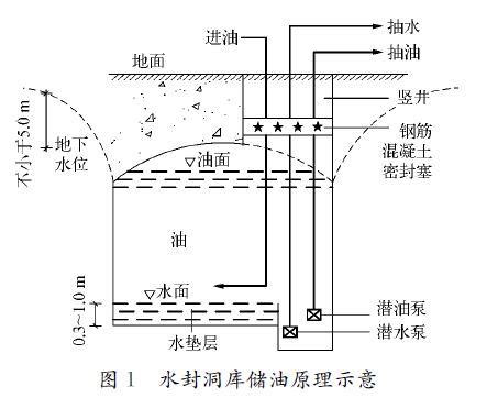 1.1 儲(chǔ)油原理水封洞庫(kù)通過人工在地下巖石中開挖形成,其密封是通過地下水向洞內(nèi)滲透實(shí)現(xiàn),即水封洞庫(kù)必須建在穩(wěn)定的地下水位線以下一定的深度,洞罐的埋深與洞室儲(chǔ)存介質(zhì)的*大工作壓力、工程地質(zhì)和水文地質(zhì)條件、穩(wěn)定的地下水位等因素有關(guān),其埋深應(yīng)保證洞庫(kù)周圍的地下水壓力大于洞內(nèi)儲(chǔ)存介質(zhì)的壓力。正常儲(chǔ)存時(shí),洞外部地下水壓力大于洞內(nèi)介質(zhì)壓力,地下水只能向洞內(nèi)滲透,而洞內(nèi)介質(zhì)不能向洞外滲漏,同時(shí)利用油比水密度小以及油水不能混溶的特點(diǎn),滲入洞內(nèi)的水沿洞壁匯集到洞底部形成水墊層,從而達(dá)到將所儲(chǔ)介質(zhì)封在洞內(nèi)的目的。滲入洞內(nèi)的水可由油水界面檢測(cè)儀表進(jìn)行檢測(cè),待達(dá)到一定高度時(shí),用安裝在洞內(nèi)的潛水泵將水排出洞外。水封洞庫(kù)儲(chǔ)油方法有固定水位法和變動(dòng)水位法,采用變動(dòng)水位法儲(chǔ)油新鮮水的需求量和污水處理量大,運(yùn)行費(fèi)用高,因而目前多采用固定水位法,儲(chǔ)油原理示意如圖1所示。