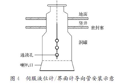 儀表安裝應(yīng)便于儀表維護(hù)、更換及觀測(cè),儀表的觀測(cè)面應(yīng)朝向操作通道,周圍不應(yīng)有妨礙維修儀表的物件,因而洞罐液位計(jì)、界面計(jì)和多點(diǎn)平均溫度計(jì)的變送單元均安裝在豎井口??紤]到洞罐埋設(shè)深度及洞罐儀表檢測(cè)元件的長(zhǎng)度,為便于儀表安裝,保護(hù)洞罐儀表的檢測(cè)元件,為伺服液位計(jì)、伺服界面計(jì)及多點(diǎn)平均溫度計(jì)設(shè)置了液位計(jì)、界面計(jì)導(dǎo)向管及溫度計(jì)保護(hù)管。導(dǎo)向管、保護(hù)管安裝時(shí),從上到下的垂直誤差一般小于導(dǎo)向管、保護(hù)管口徑的10%,并徹底處理好導(dǎo)向管通液孔的毛刺;焊接必須采用套焊,焊縫必須清理干凈;安裝時(shí),必須保證洞罐儀表與導(dǎo)向管、保護(hù)管連接法蘭的水平度,一般控制在1°之內(nèi),伺服液位計(jì)、界面計(jì)導(dǎo)向管安裝示意如圖4所示。