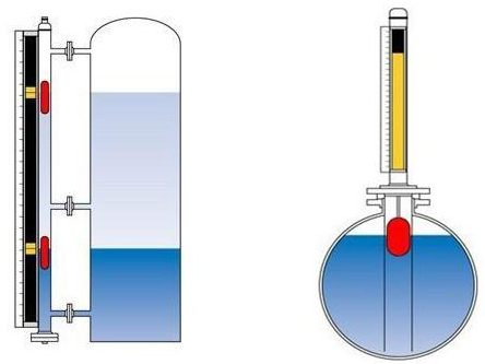 液位計(jì)根據(jù)浮力原理,浮子在測(cè)量管內(nèi)隨液位的升降而上下移動(dòng),浮子內(nèi)的永久磁鋼通過磁耦合作用,驅(qū)動(dòng)紅、白色翻柱翻轉(zhuǎn)180’液位上升時(shí),翻柱由白色轉(zhuǎn)為紅色,下降時(shí),翻柱由紅色轉(zhuǎn)為白色,從而實(shí)現(xiàn)液位的指示。