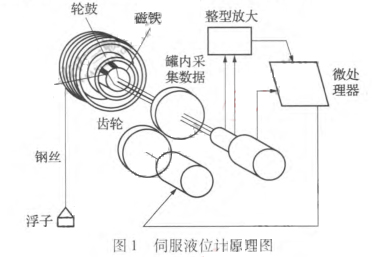 伺服液位計(jì)具有智能性、高精度等優(yōu)點(diǎn)。從前文的分類角度而言,伺服液位計(jì)屬于接觸式、力學(xué)原理類的智能液位計(jì)。它的工作原理是基于浮力平衡原理,由微型伺服電機(jī)連接細(xì)鋼絲驅(qū)動(dòng)體積較小的浮子,形成一個(gè)閉環(huán)反饋系統(tǒng),如圖1所示。當(dāng)液位計(jì)工作時(shí),浮子自身產(chǎn)生的重力作用于細(xì)鋼絲上,在外輪鼓產(chǎn)生力矩,從而引起磁通量的變化,磁通量的變化將導(dǎo)致電磁傳感器的輸出電壓信號發(fā)生變化。將電壓值與存儲(chǔ)于CPU中的參考電壓進(jìn)行比較,當(dāng)達(dá)到浮力平衡時(shí),電壓差值為零。此時(shí)測量纏繞在輪鼓上細(xì)鋼絲所經(jīng)歷的長度變化,得出液位變化情況,由于輪鼓對鋼絲的測量分辨率很小,從而使得伺服液位計(jì)能夠達(dá)到±1mm左右的精確度。