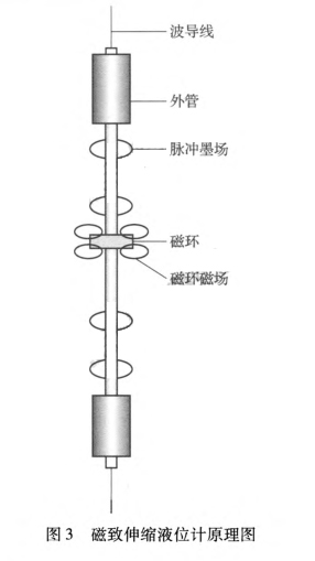 磁致伸縮液位計(jì)是根據(jù)磁致伸縮原理進(jìn)行工作的液位計(jì),具體工作原理:在非磁性的波導(dǎo)管內(nèi)安裝一根磁致波導(dǎo)線,波導(dǎo)管外部安裝有隨液面進(jìn)行上下運(yùn)動(dòng)的磁性浮子,在磁致波導(dǎo)線的其中一端裝有壓磁傳感器,傳感器在每個(gè)時(shí)間單位發(fā)出一定數(shù)量的電流脈沖信號,此信號沿著磁致波導(dǎo)線向下傳送,從而產(chǎn)生一個(gè)向下運(yùn)動(dòng)的磁環(huán)磁場,該磁環(huán)磁場同磁性浮子的磁場相互作用,從而產(chǎn)生一個(gè)脈沖磁場,脈沖以已知速度沿磁致波導(dǎo)線運(yùn)動(dòng),并被壓磁傳感器接收,通過計(jì)算起始電流脈沖和返回脈沖的時(shí)間間隔得出浮子的位置,如圖3所示。
