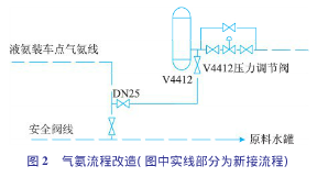 1)將液氨裝車氣氨返回線由進(jìn)酸性水中間罐改為進(jìn)氨氣分液罐V4412。以前,氣氨返回線至酸性水中間罐,由于液氨裝車時(shí)有大量氣氨返回原料水中間罐,氣氨不能及時(shí)吸收、溶解,造成原料水中間罐(V4410或V5407)壓力上升,水封被破壞,罐內(nèi)氣體外逸,形成安全環(huán)保隱患。為減少原料水罐氣氨返回量,在大檢修期間,增加了氣氨至V4412入口管線流程(氨壓機(jī)入口)。具體流程見(jiàn)圖2。