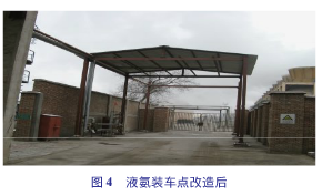 4)液氨裝車點(diǎn)移位改造。液氨裝車點(diǎn)不規(guī)范。根據(jù)相關(guān)要求,液氨裝車時(shí),周圍不能有機(jī)動(dòng)車通行,但液氨裝車點(diǎn)位于14號(hào)馬路西側(cè)5m處,對(duì)車輛及施工人員并無(wú)法完全封閉,裝車存在很大的安全風(fēng)險(xiǎn)。以前,液氨裝車由汽提崗位外操負(fù)責(zé),由于外操工作繁忙,造成液氨裝車過(guò)程的監(jiān)督時(shí)斷時(shí)續(xù),為解決這一隱患,車間指派專人負(fù)責(zé)監(jiān)管液氨裝車的全過(guò)程。監(jiān)管人員不但要檢查接頭有無(wú)泄漏,還要核實(shí)駕駛員和押運(yùn)員的資質(zhì)。車間根據(jù)液氨裝車的實(shí)際情況,編制《液氨裝車泄漏應(yīng)急操作卡》、《液氨裝車操作規(guī)程》,以便進(jìn)一步規(guī)范液氨裝車操作程序。應(yīng)分開(kāi)設(shè)置液氨裝卸站的進(jìn)出口,當(dāng)進(jìn)出口合用時(shí),站內(nèi)應(yīng)設(shè)回車場(chǎng)。由于液氨裝車點(diǎn)東側(cè)5m處就是煉油區(qū)雨排系統(tǒng),為了解決液氨裝車過(guò)程泄漏噴淋水污染公司煉油區(qū)雨排系統(tǒng),在裝車點(diǎn)東西側(cè)各增設(shè)圍堰。從圖4可以看出:液氨裝車點(diǎn)改造后,現(xiàn)場(chǎng)更為規(guī)范,管理更為嚴(yán)格。