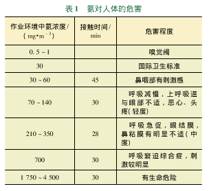 氨氣是一種無(wú)色透明而具有刺激性氣味的氣體,*易溶于水成為氨水(又稱氫氧化銨),呈弱堿性,1%水溶液pH值11.7。氨易液化,經(jīng)壓縮后成為液氨。根據(jù)衛(wèi)法監(jiān)發(fā)(2003)142號(hào)《高毒物品目錄》,氨氣屬于2.3類高毒氣體,8類腐蝕品,火災(zāi)爆炸危險(xiǎn)性類別為乙A類。氨與空氣混合到一定比例時(shí),遇明火能引起爆炸,其爆炸*限(體積分?jǐn)?shù))為15.5%~25%。低濃度氨對(duì)粘膜有刺激作用。高濃度氨可引起組織溶解性壞死、皮膚及上呼吸道粘膜化學(xué)性炎癥及燒傷、肺充血、肺水腫及出血等。常易發(fā)生輕度、重度中毒。外露皮膚可出現(xiàn)II度化學(xué)灼傷。氨對(duì)人體的危害見(jiàn)表1。