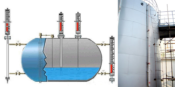 磁翻板液位計測量液體時采用頂裝或旁通管側(cè)裝方式。磁翻柱主體外加裝翻柱液位指示器、液位開關(guān)及液位變送器。磁單元置于浮球內(nèi)部或通過頂桿與浮球相連,當(dāng)浮球連帶磁單 元隨液位變化時,使磁性色塊(磁翻板)翻轉(zhuǎn);磁性液位開關(guān)在對應(yīng)液位點動作;同時液位傳感器在浮球磁力的作用下,輸出標(biāo)準(zhǔn)的變化電阻信號,再經(jīng)過變送器把電阻信號轉(zhuǎn)換 成4~20mA電流信號輸出。