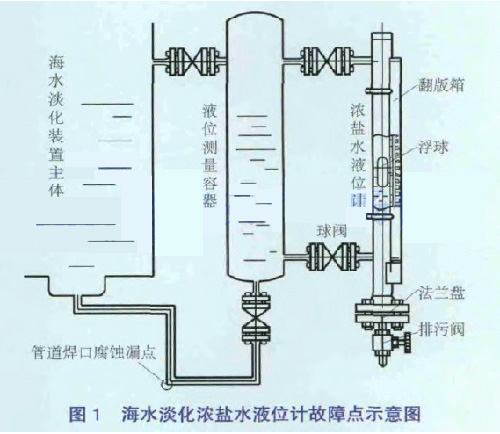 2013年12月16日0:20海淡水化裝置主體U3濃鹽水液位計(jì)開始出現(xiàn)30%~70%的波動(dòng),檢查液位計(jì)本體無異常,將液位計(jì)上、下閥門關(guān)小后,液位測量波動(dòng)減小,但故障現(xiàn)象并未消失。利用高爐休風(fēng)機(jī)會(huì)降海水淡化U3主體負(fù)荷并查找故障原因。將液位計(jì)上、下閥門全關(guān)閉并拆下下部絲堵,打開排污閥徹底進(jìn)行排氣排污處理,檢測磁性浮子,未發(fā)現(xiàn)異常。當(dāng)投運(yùn)后波動(dòng)現(xiàn)象存在。濃鹽水液位計(jì)更換后再次試投運(yùn),發(fā)現(xiàn)液位計(jì)液位顯示波動(dòng)更大、更頻繁。經(jīng)過排查發(fā)現(xiàn)與液位測量容器(見圖1)連接的管道焊接處有漏點(diǎn),對(duì)該漏點(diǎn)進(jìn)行封堵后液位測量顯示恢復(fù)穩(wěn)定,負(fù)荷狀態(tài)生產(chǎn)恢復(fù)正常。